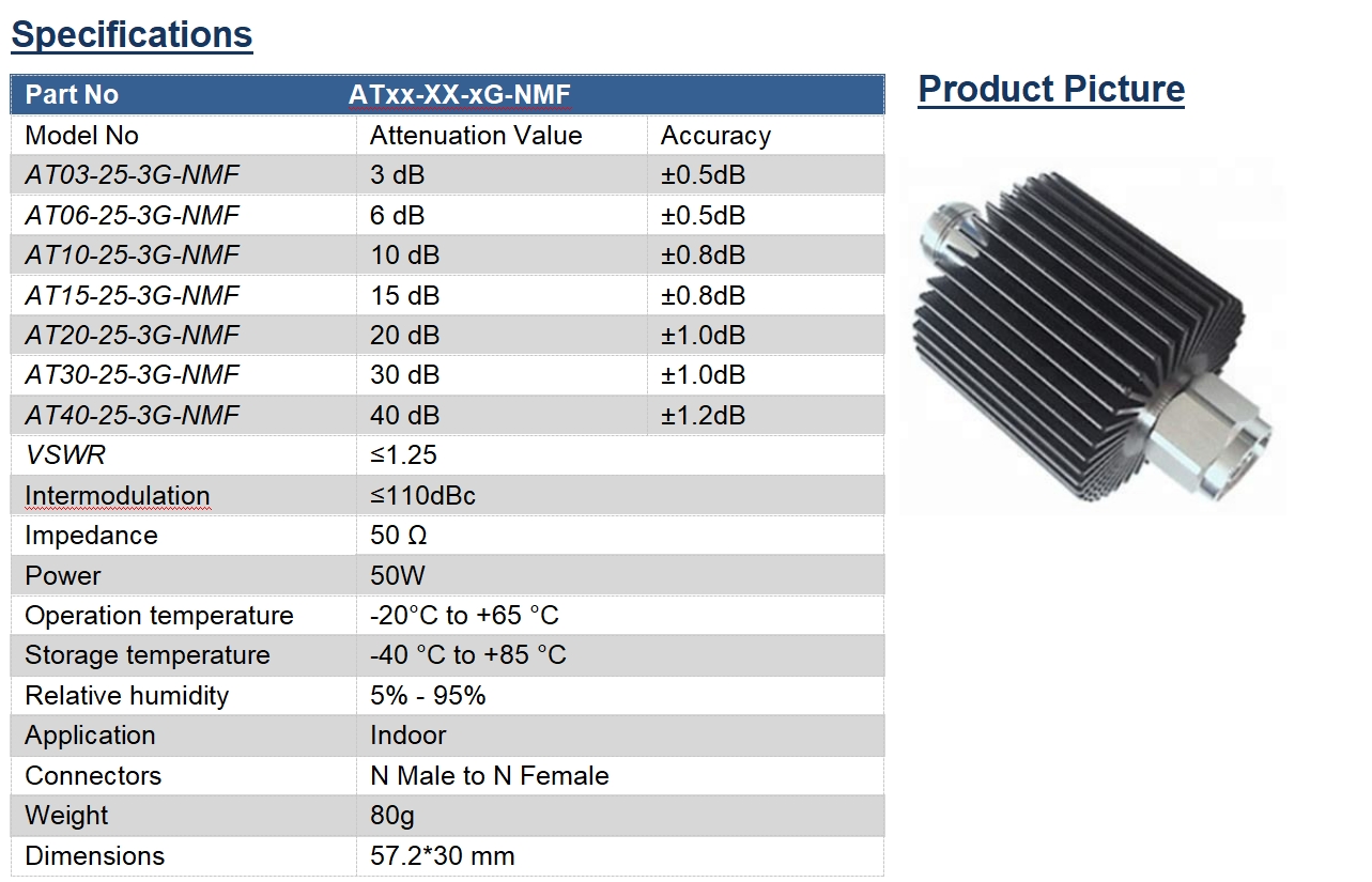 - Product description: Attenuator 25W DC-3GHz N Type